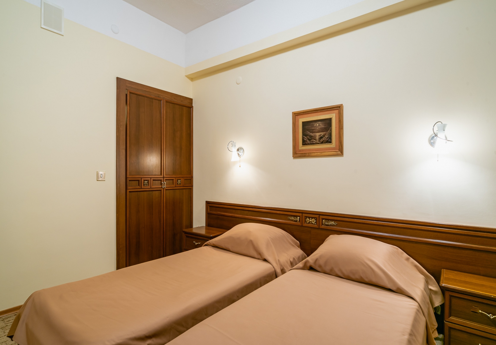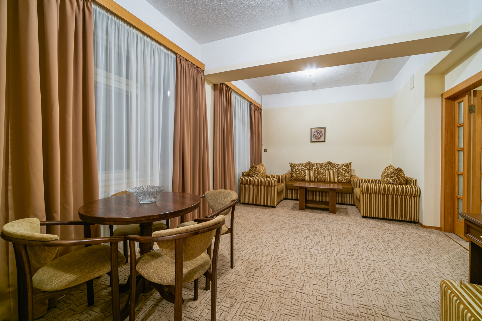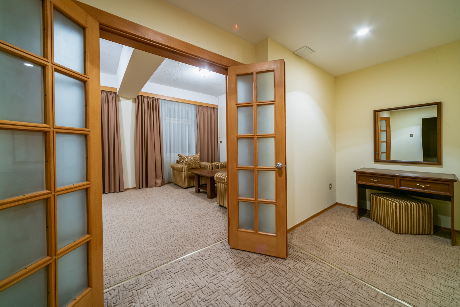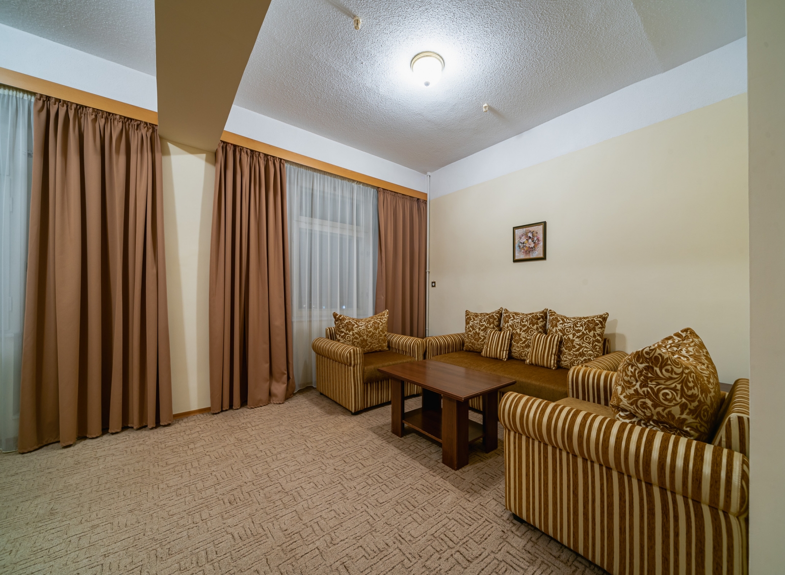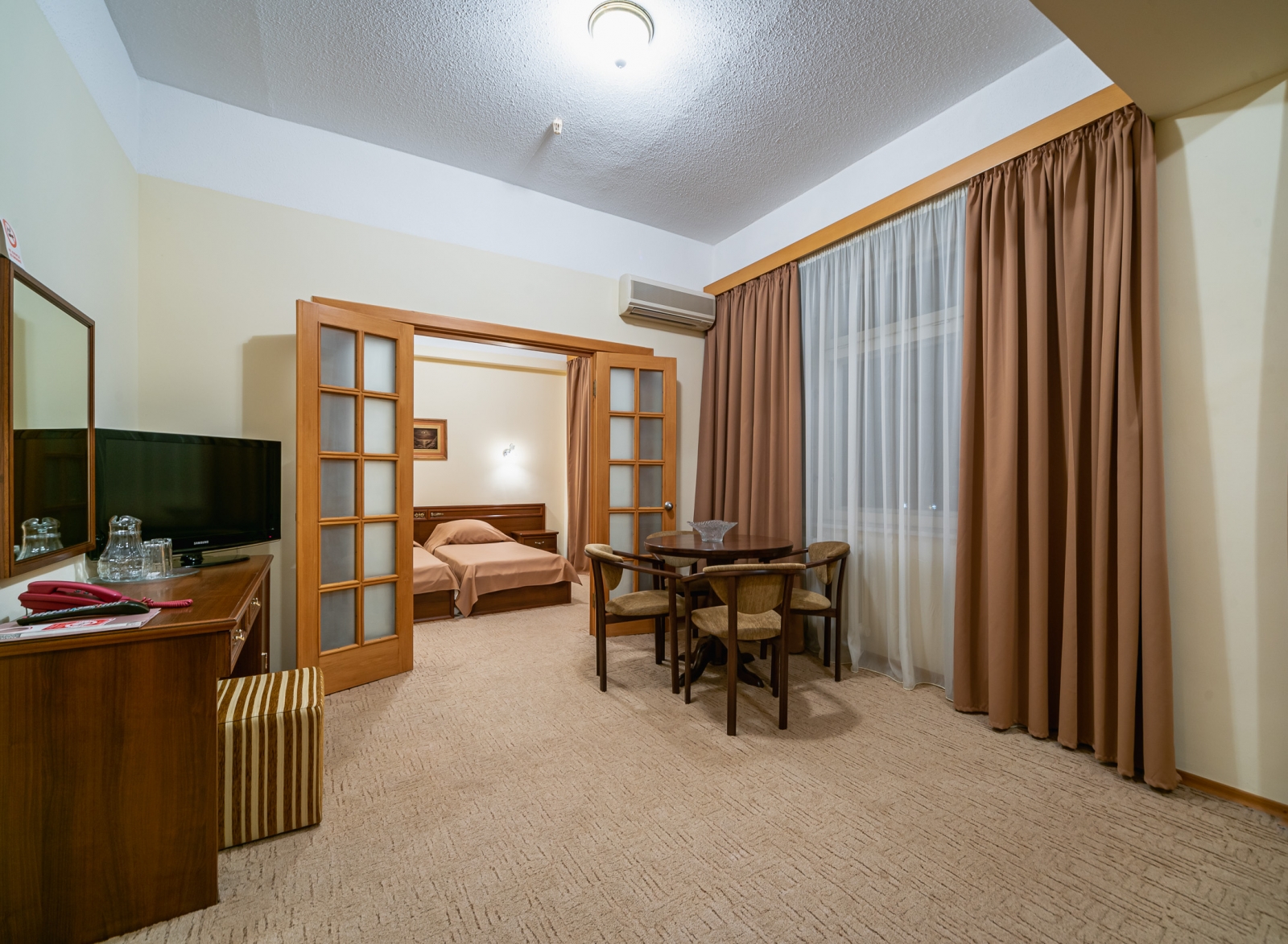 Площадь номера - 42 кв.м. 2 осн. места. 2 доп. места. Балкон. Мебель: вешалка, зеркало, кровать двуспальная, прикроватные тумбочки, стол, стулья, шкаф. Оборудование: кондиционер, сейф, телевизор, телефон. Санузел: биде, с джакузи, туалетные принадлежности. Сервис: смена полотенец, смена постельного белья, уборка номера, услуги внутренней телефонной связи.