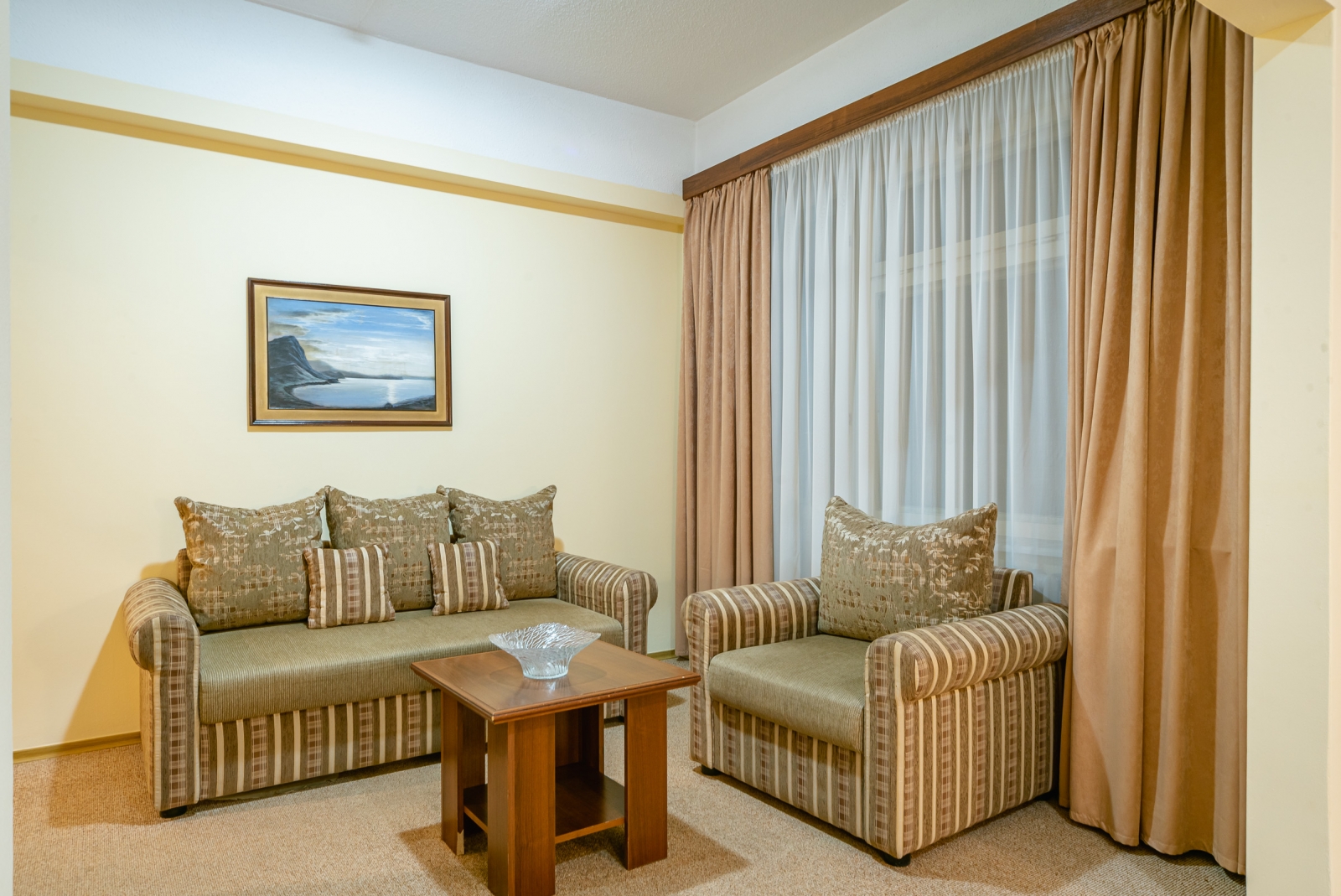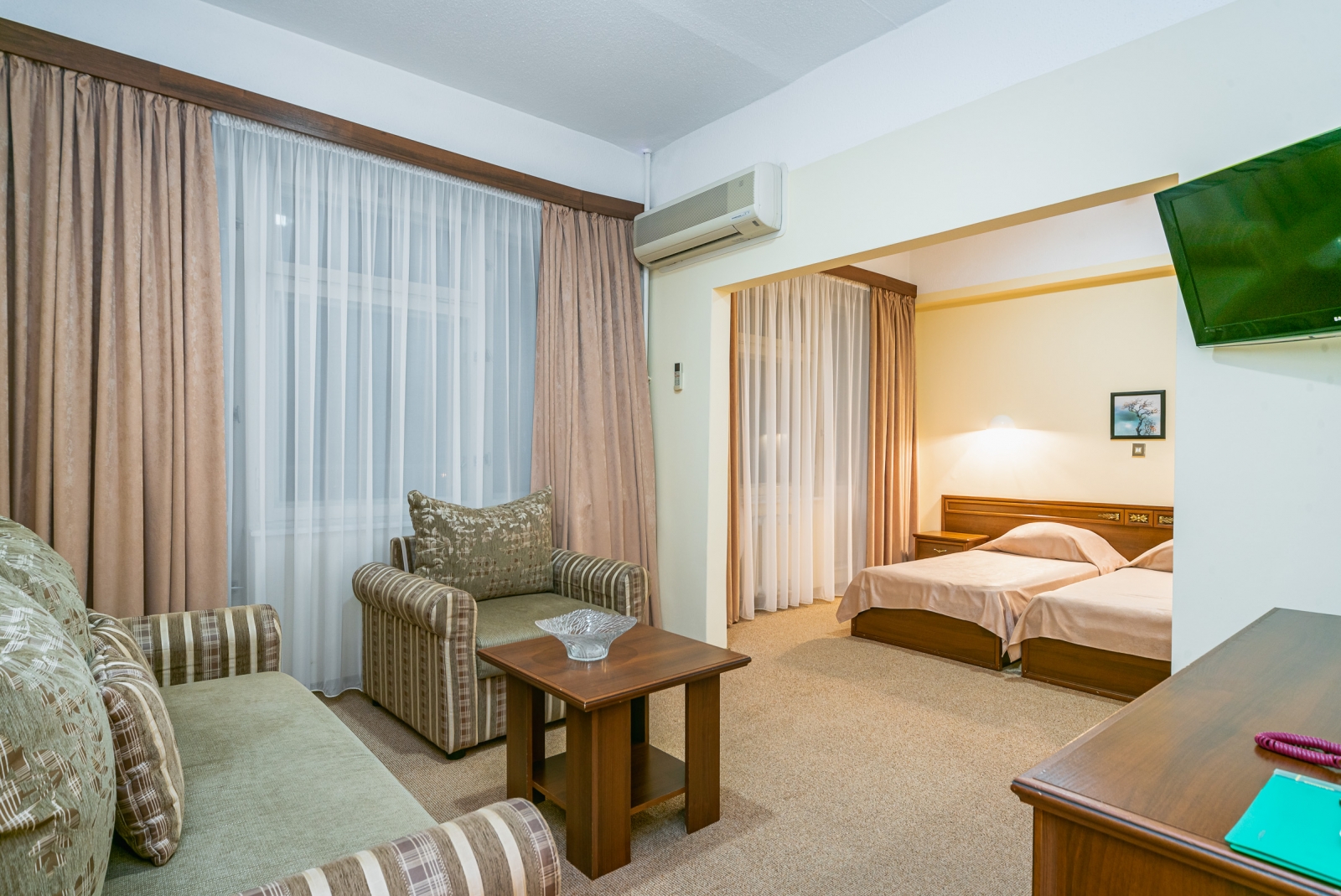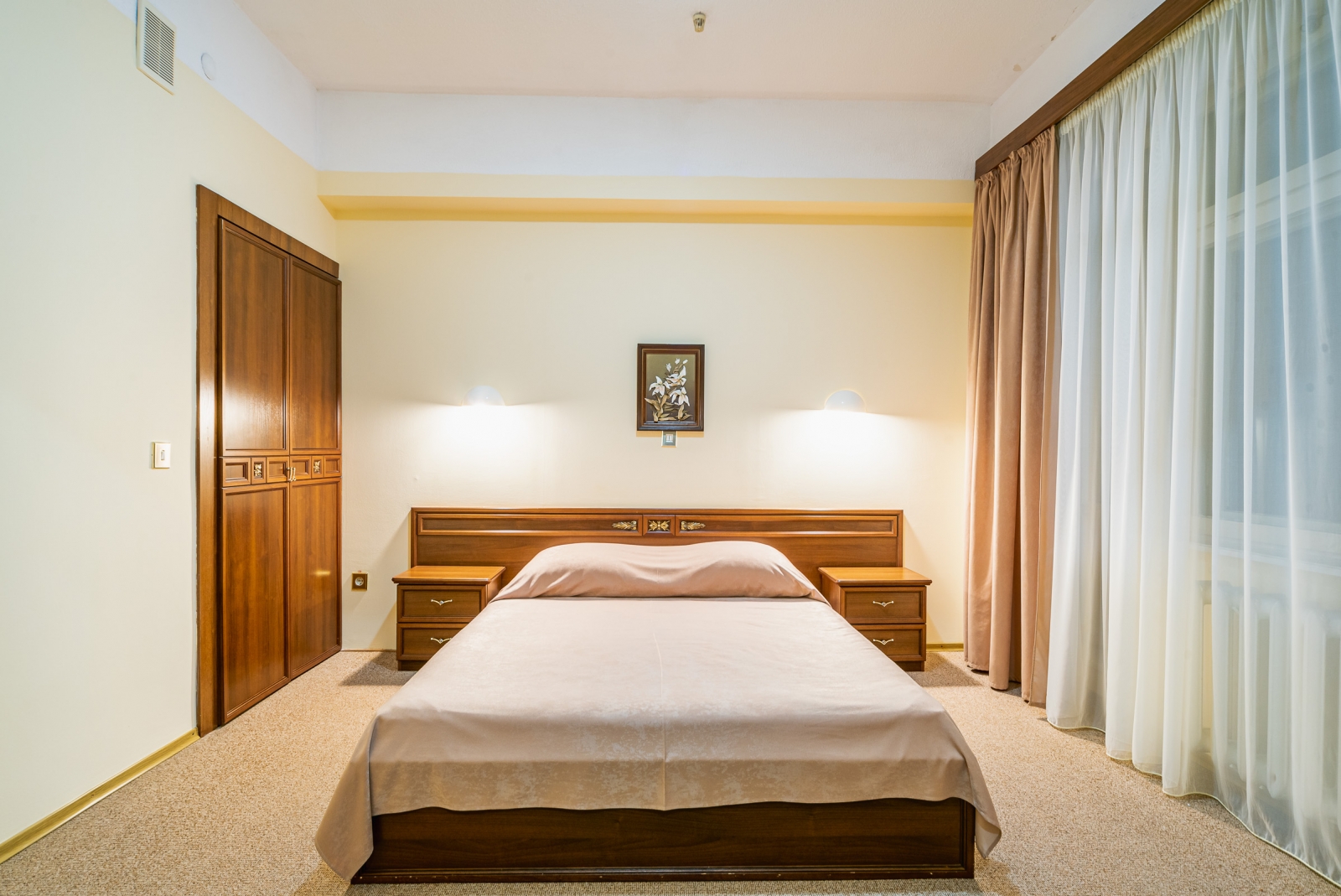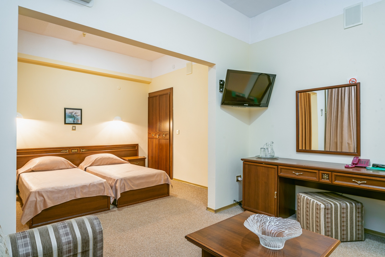 Площадь номера - 28 кв.м. 2 осн. места. 1 доп. место. Балкон. Мебель: вешалка, зеркало, кровать двуспальная, прикроватные тумбочки, стол, стулья, шкаф. Оборудование: кондиционер, сейф, телевизор, телефон. Санузел: с ванной, туалетные принадлежности. Сервис: смена полотенец, смена постельного белья, уборка номера, услуги внутренней телефонной связи.